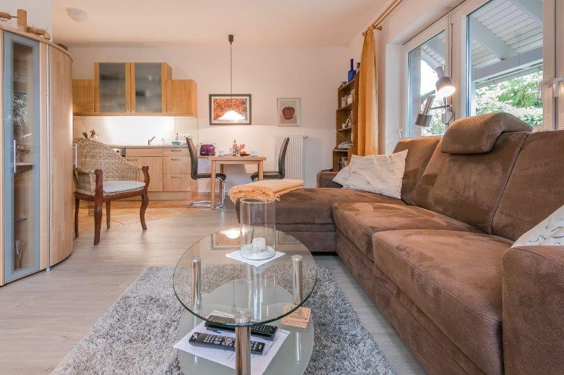 Hier finden Sie alles für einen angenehmen Aufenthalt auf Zeit. Sie betreten das Apartment im geräumigen Flur, von dem aus alle Räume zugänglich sind. Der direkte Blick geht in die offene Küche mit angrenzendem Ess- und Wohnzimmer. Die Küche ist mit allem ausgestattet was man für den Alltag benötigt. Das gezauberte Mahl kann dann an dem angrenzenden Esstisch verzehrt werden. Für die Abende auf der Couch ist auch gesorgt, ein großes Sofa lädt auf gemütliche Abende ein. – Erst die Arbeit, dann das Vergnügen – So heißt es doch so schön…Der kleine Arbeitsplatz im Ess- und Wohnbereich freut sich auf einen Besuch von Ihnen und Ihrem Laptop!