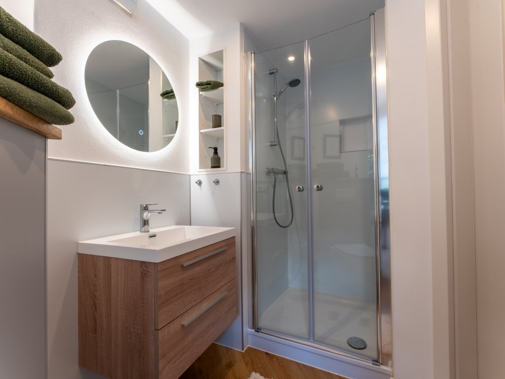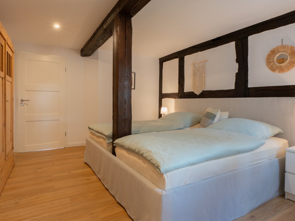 Weiter hinten befindet sich das gemütliche Schlafzimmer mit einem Doppelbett (180cm x 200cm) und einem Kleiderschrank und das helle Duschbad mit viel Tageslicht.
