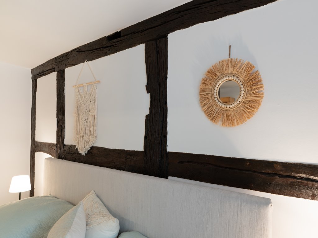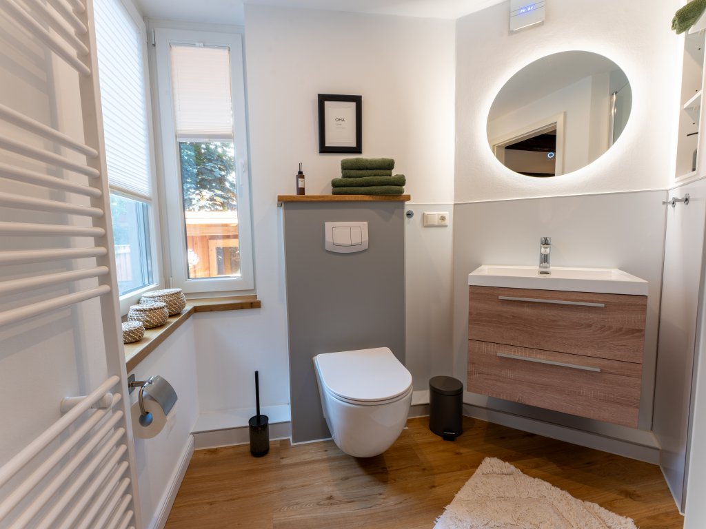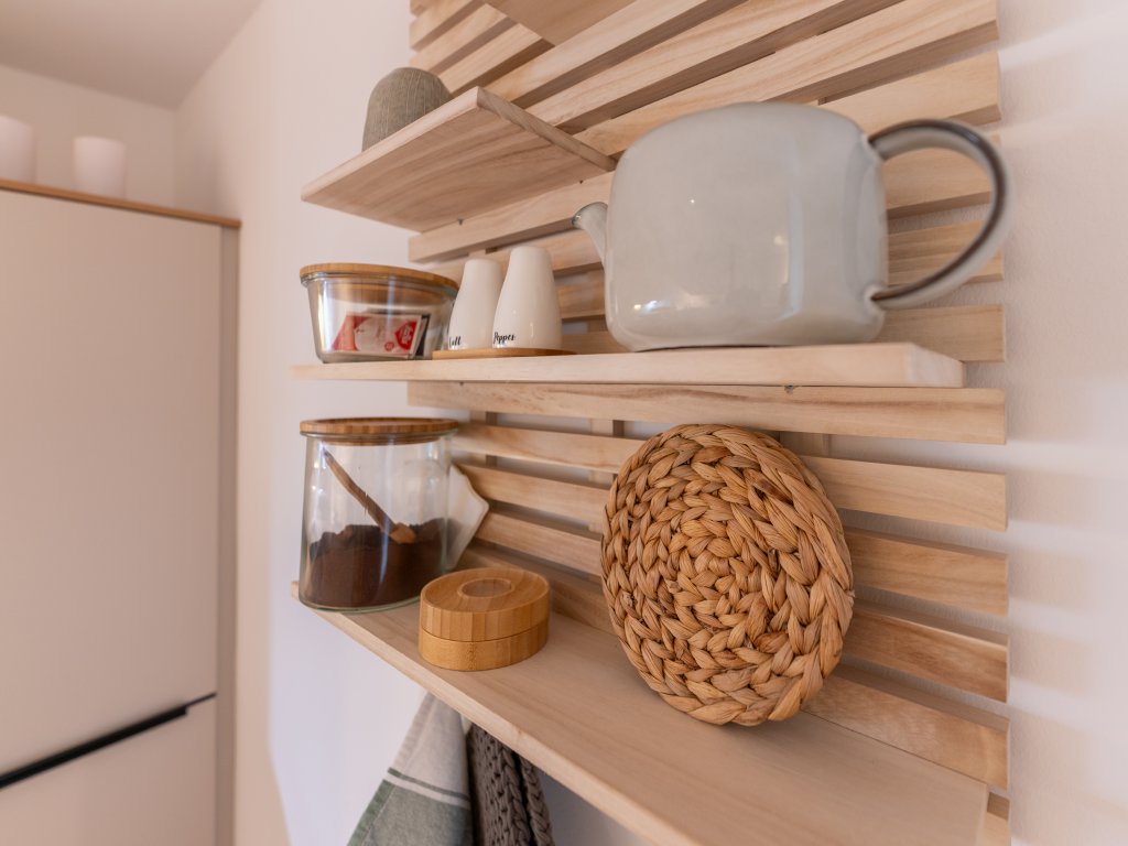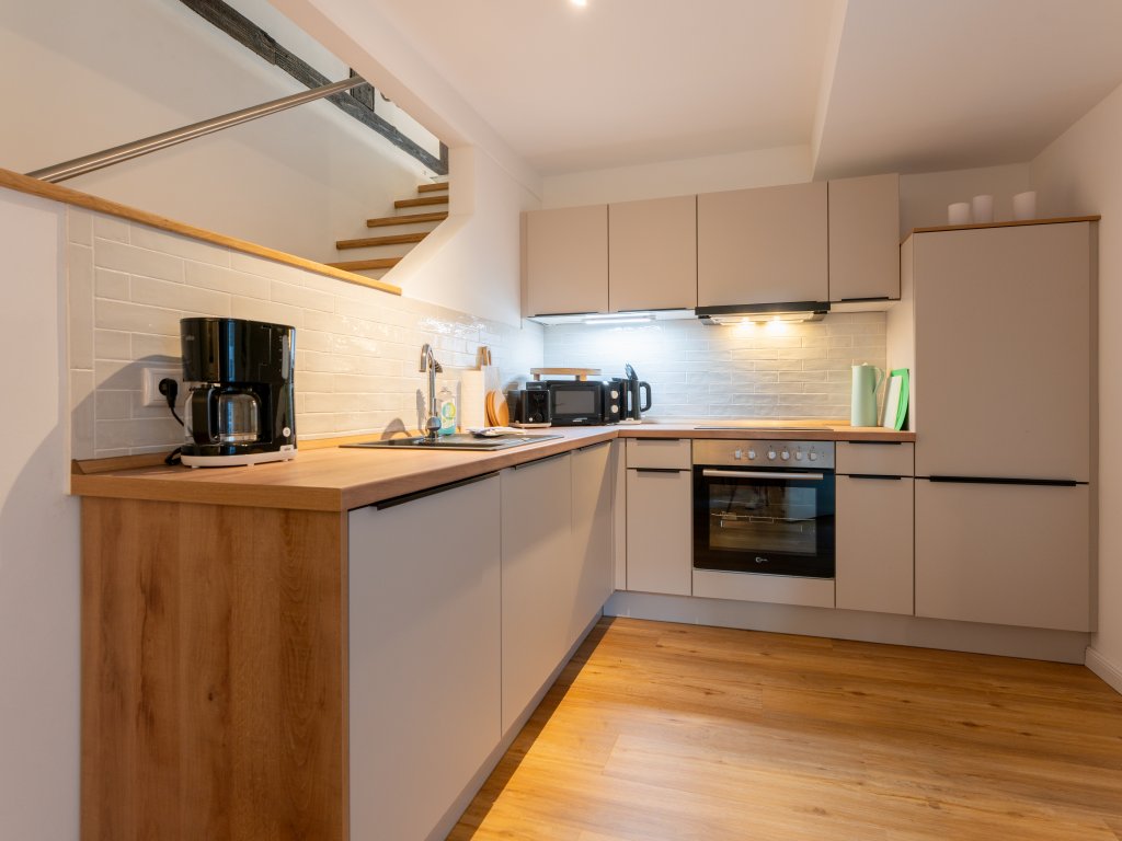 Die Einbauküche befindet sich die Treppe runter im Souterrain. Sie lässt keine Wünsche offen. Hier finden Sie alle notwendigen Geräte und Utensilien, um sich selbst zu versorgen. Auch die Waschmaschine ist hier untergebracht. Genießen Sie Ihr Frühstück am Esstisch in der Küche oder auf der sonnigen kleinen Terrasse und starten Sie entspannt in den Tag. Ein Stellplatz für Ihr Auto befindet sich direkt hinter dem Haus und ist bereits im Mietpreis inbegriffen.